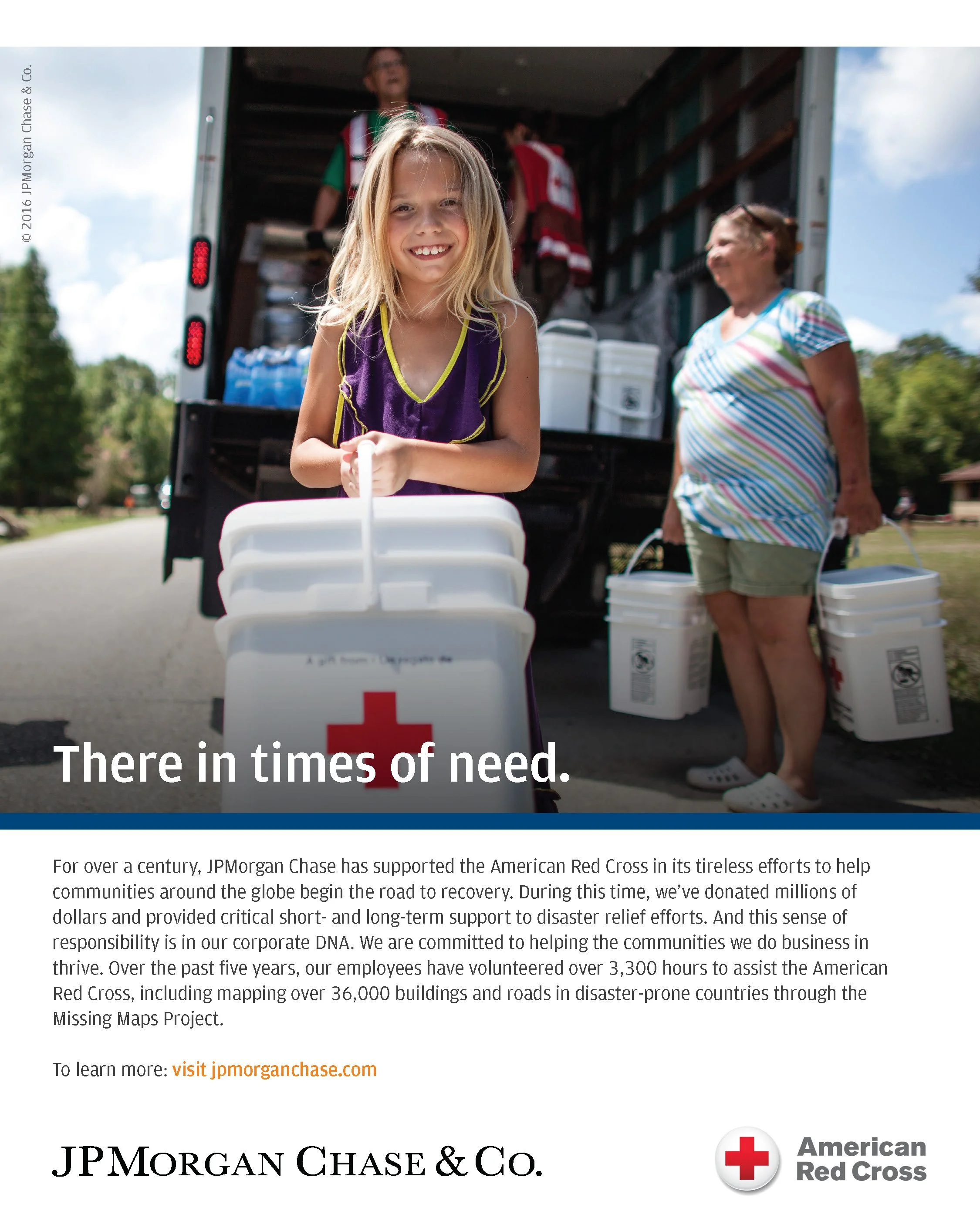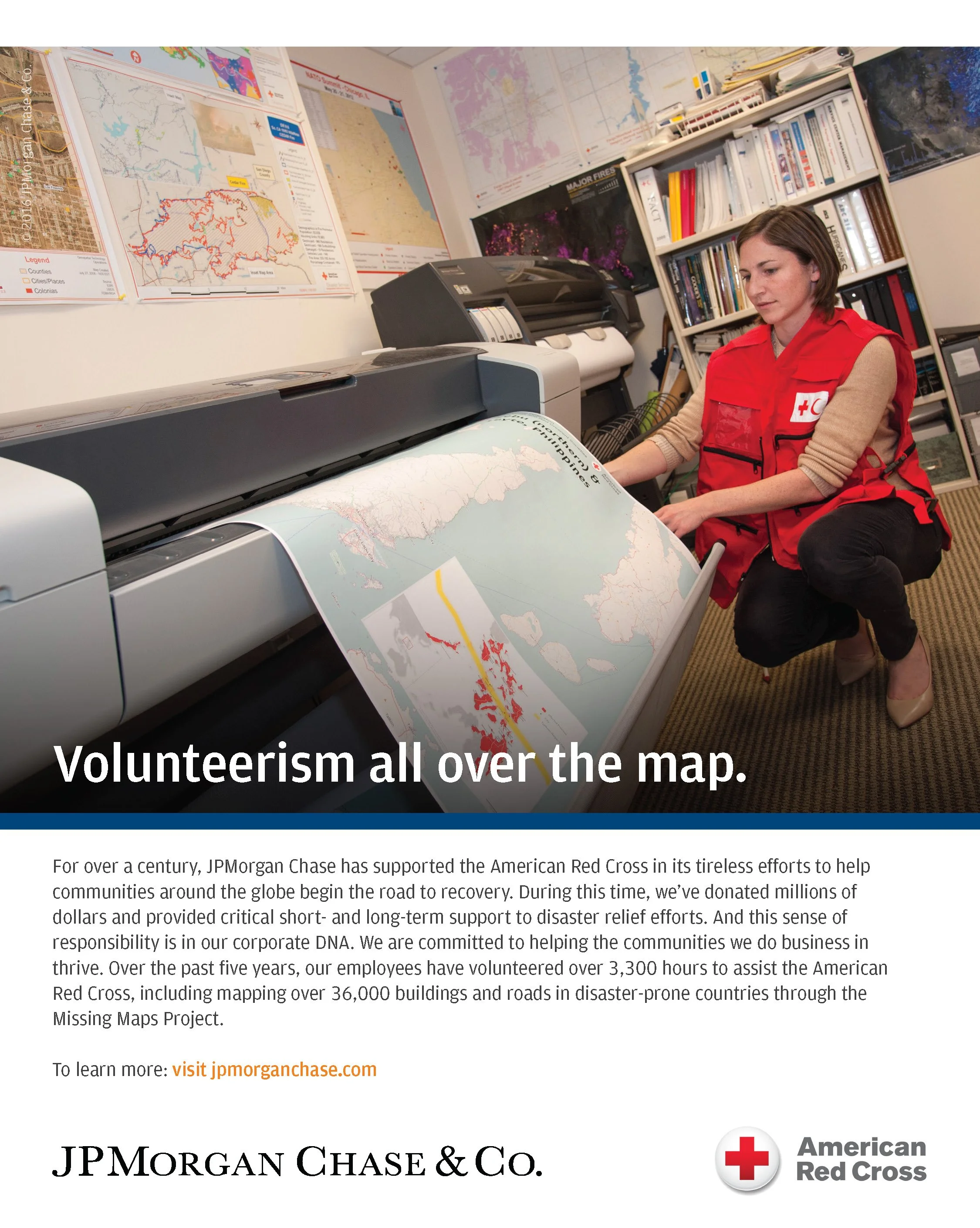 This print campaign for J.P. Morgan Chase promotes the companies commitment to their communities through support of the American Red Cross. Assets were provided by the client and our task was to select visuals, pair with creative headlines and layout in accordance with their brand systems.